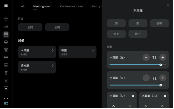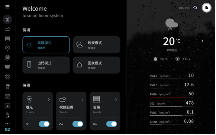 支援依生活習慣設計個人化情境,如「出門」、「回家」、「觀影」、「起床」等,自動執行燈光、窗簾、空調等設備設定。